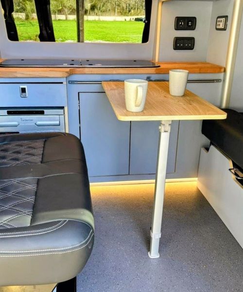 Freshly converted in March 2026, Arwen comes well equipped – gas hob, sink, fridge/freezer, Rock & Roll sofa/bed for two and Scottish themed colours throughout! It has a pop top for sleeping two children or one adult. The front twin seats swivel to create more space and a living/eating area.